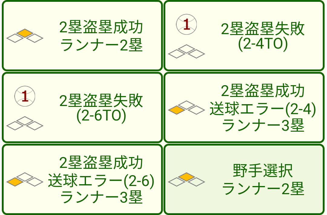 ほかに走者がいたり、ワイルドピッチやパスボールが盗塁と同時に発生した場合も、それぞれ適切なオプションが表示されます。